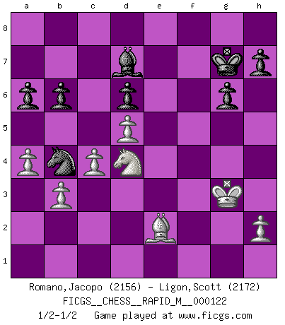 Last move : 1/2-1/2 2021 February 7 19:24:48 [Event "FICGS__CHESS__RAPID_M__000122"] [Site "FICGS"] [Date "2021.01.09"] [Round "1"] [White "Romano,Jacopo"] [Black "Ligon,Scott"] [Result "1/2-1/2"] [WhiteElo "2156"] [BlackElo "2172"] 1.e4 c5 2.Nf3 Nc6 3.d4 cxd4 4.Nxd4 Nf6 5.Nc3 e5 6.Ndb5 d6 7.Nd5 Nxd5 8.exd5 Nb8 9.c4 Be7 10.Be2 a6 11.Nc3 O-O 12.O-O f5 13.f4 Bf6 14.Qc2 Nd7 15.Kh1 g6 16.Be3 b6 17.fxe5 Bxe5 18.g3 Re8 19.Qd2 Qe7 20.Rac1 Rb8 21.Bh6 Bg7 22.Bxg7 Kxg7 23.b3 Qe3 24.Qxe3 Rxe3 25.Kg1 Re8 26.Bd1 Ne5 27.Ne2 Bd7 28.a4 Nd3 29.Rc2 Nb4 30.Rd2 Re3 31.Nd4 Rbe8 32.Rf3 R3e4 33.Rc3 f4 34.Bf3 Re1+ 35.Kg2 fxg3 36.Kxg3 R8e3 37.Rxe3 Rxe3 38.Re2 Rxe2 39.Bxe2 1/2-1/2 Sicilian : Pelikan (Lasker/Sveshnikov) variation Kingside Castling by player Black (move 11) Kingside Castling by player White (move 12) This chess game ended in a draw. Follow this game move after move (download)In complicated positions, Bobby Fischer hardly had to be afraid of anybody. (Paul Keres) Je mehr ich von der FIDE weiss, um so weniger verstehe ich. (Alexander Kalifman) El Ajedrez expande y enriquece tu mente. (Saudin Robovic) Des points faibles ou des trous dans la position de l'adversaire doivent être occupés par des pièces et non pas par des pions. (Siegbert Tarrasch) As the days dwindle down... to a precious few. (Maxwell Anderson)