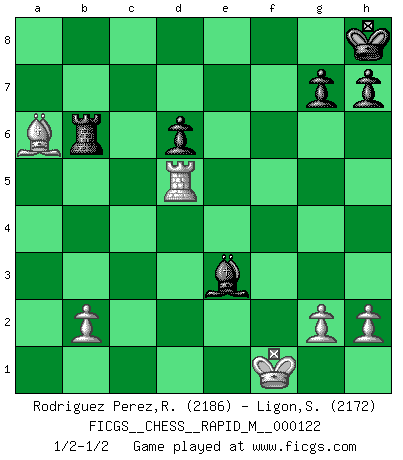 Last move : 1/2-1/2 2021 February 20 1:4:25 [Event "FICGS__CHESS__RAPID_M__000122"] [Site "FICGS"] [Date "2021.01.09"] [Round "1"] [White "Rodriguez Perez,Rene"] [Black "Ligon,Scott"] [Result "1/2-1/2"] [WhiteElo "2186"] [BlackElo "2172"] 1.e4 c5 2.Nf3 Nc6 3.d4 cxd4 4.Nxd4 Nf6 5.Nc3 e5 6.Ndb5 d6 7.Bg5 a6 8.Na3 b5 9.Nd5 Be7 10.Bxf6 Bxf6 11.c3 Bg5 12.Nc2 Rb8 13.a4 bxa4 14.Ncb4 Nxb4 15.cxb4 Bd7 16.Bxa6 O-O 17.O-O Bc6 18.Rxa4 Bxa4 19.Qxa4 Kh8 20.b5 Qd7 21.Qc2 f5 22.exf5 Qxf5 23.Qxf5 Rxf5 24.b6 e4 25.Rd1 e3 26.fxe3 Rxd5 27.Rxd5 Bxe3+ 28.Kf1 Rxb6 1/2-1/2 Sicilian : Pelikan (Lasker/Sveshnikov) variation Kingside Castling by player Black (move 16) Kingside Castling by player White (move 17) This chess game ended in a draw. Follow this game move after move (download)A great player and a great example for many. His book My 60 Memorable Games had a big impact on me. It is a shame he didn't continue to enrich the world of chess with his unparalleled understanding after 1972. (Jan Timman, about Bobby Fischer's death) Ja, ich habe einmal eine Blitzpartie gespielt, es war in einem Zug, 1929. --im Interview 1989 (Mikhail Moiseyevich Botvinik) El Ajedrez te enseña a controlarl la excitación inicial que sientes cuando vez algo que parece bueno y te enseña a pensar objetivamente cuando te encuentras en problemas. (Stanley Kubrick) Les échecs, c'est l'imagination. (David Bronstein) The problem with troubleshooting is that trouble shoots back. (Anonymous)