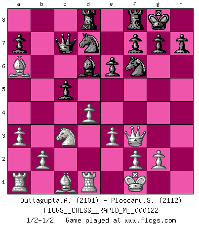 Last move : 1/2-1/2 2021 March 17 15:34:33 [Event "FICGS__CHESS__RAPID_M__000122"] [Site "FICGS"] [Date "2021.01.09"] [Round "1"] [White "Duttagupta,Aniruddha"] [Black "Ploscaru,Stelian"] [Result "1/2-1/2"] [WhiteElo "2101"] [BlackElo "2112"] 1.d4 d5 2.c4 e6 3.Nc3 Nf6 4.Nf3 c6 5.e3 Nbd7 6.Bd3 dxc4 7.Bxc4 b5 8.Bd3 Bb7 9.a3 Bd6 10.O-O O-O 11.Qc2 Rc8 12.Rd1 c5 13.Bxb5 Qc7 14.Qe2 Bxf3 15.Qxf3 Bxh2+ 16.Kf1 Bd6 17.Ba6 Rcd8 1/2-1/2 QGD Semi-Slav : Meran variation Kingside Castling by player White (move 10) Kingside Castling by player Black (move 10) This chess game ended in a draw. Follow this game move after move (download)No one ever won a game by resigning. (Unknown) Ich bin Weltmeister und muß mit niemandem irgend etwas diskutieren. (Viswanathan Anand) Las ideas audaces son como las piezas del Ajedrez que avanzan hacia adelante. Ellas pueden ser vencidas, pero también pueden iniciar una partida victoriosa. (Goethe) Les Echecs ne sont pas pour les âmes timides. Ils requièrent un homme entier, qui ne s'arrête pas aveuglément à ce qui a été déjà établi, mais qui tente individuellement de sonder les profondeurs du jeu. (W. Steinitz) Thibault, I ask for draw. Game 13876. - Sorry Ilmars, you won. (FICGS chat)