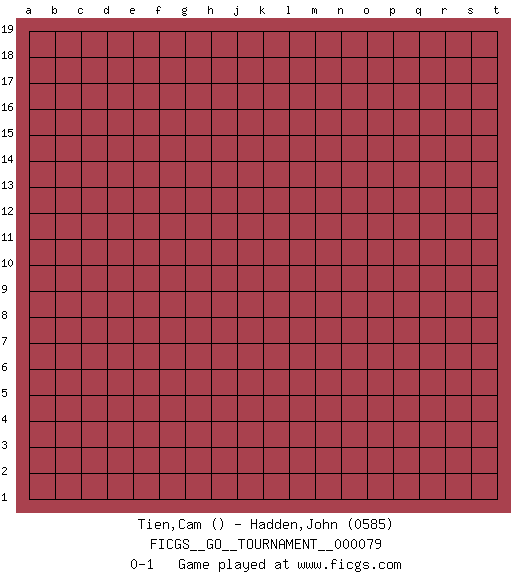 Last move : 0-1 2021 February 9 4:8:48 [Event "FICGS__GO__TOURNAMENT__000079"] [Site "FICGS"] [Date "2021.01.09"] [Round "1"] [Black "Tien,Cam"] [White "Hadden,John"] [Result "0-1"] [Rating 2 "0585"] 0-1 This go game has been lost on time (started : 2021.01.09 17:14:11) Here are the names of the openings (joseki) played in the four corners : Player White won this Go (weiqi, baduk) game. Follow this game move after move (download)Take the cutting stone on the second line. (Anonymous) Empty your mind, be formless, shapeless — like water. (Bruce Lee)