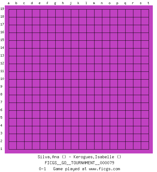 Last move : 0-1 2021 February 9 4:8:48 [Event "FICGS__GO__TOURNAMENT__000079"] [Site "FICGS"] [Date "2021.01.09"] [Round "1"] [Black "Silva,Ana"] [White "Kerogues,Isabelle"] [Result "0-1"] 0-1 This go game has been lost on time (started : 2021.01.09 17:14:11) Here are the names of the openings (joseki) played in the four corners : Player White won this Go (weiqi, baduk) game. Follow this game move after move (download)There are players who don't accept exchange: they play many moves that perpetuate a previous state of the game. (Pierre Audouard) The quality of decision is like the well-timed swoop of a falcon which enables it to strike and destroy its victim. (Sun Tzu)