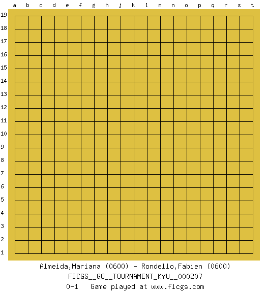 Last move : 0-1 2021 February 9 4:8:48 [Event "FICGS__GO__TOURNAMENT_KYU__000207"] [Site "FICGS"] [Date "2021.01.09"] [Round "1"] [Black "Almeida,Mariana"] [White "Rondello,Fabien"] [Result "0-1"] [Rating 1 "0600"] [Rating 2 "0600"] 0-1 This go game has been lost on time (started : 2021.01.09 23:8:4) Here are the names of the openings (joseki) played in the four corners : Player White won this Go (weiqi, baduk) game. Follow this game move after move (download)Stop on second, extend on third. (Anonymous) If we knew what we were doing, we would not call it research. (Albert Einstein)