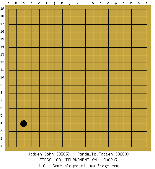Last move : 1-0 2021 February 11 12:11:7 [Event "FICGS__GO__TOURNAMENT_KYU__000207"] [Site "FICGS"] [Date "2021.01.09"] [Round "1"] [Black "Hadden,John"] [White "Rondello,Fabien"] [Result "1-0"] [Rating 1 "0585"] [Rating 2 "0600"] 1.c4 1-0 This go game has been lost on time (started : 2021.01.09 23:8:4) Here are the names of the openings (joseki) played in the four corners : Corner d4 : c4 1-0 Komoku (Somok, Xiao~mu`) 3-4 Point. The komoku (3-4) point is the traditional corner enclosure move.. Player Black won this Go (weiqi, baduk) game. Follow this game move after move (download)Go uses the most elemental materials and concepts - line and circle, wood and stone, black and white - combining them with simple rules to generate subtle strategies and complex tactics that stagger the imagination. (Iwamoto Kaoru, 9 dan professional Go player and former Honinbo title holder) Wisdom doesn't necessarily come with age. Sometimes age just shows up all by itself. (Tom Watson)