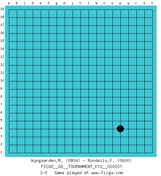 Last move : 1-0 2021 February 9 4:8:48 [Event "FICGS__GO__TOURNAMENT_KYU__000207"] [Site "FICGS"] [Date "2021.01.09"] [Round "1"] [Black "Wyngaarden,Martin"] [White "Rondello,Fabien"] [Result "1-0"] [Rating 1 "0804"] [Rating 2 "0600"] 1.p4 1-0 This go game has been lost on time (started : 2021.01.09 23:8:4) Here are the names of the openings (joseki) played in the four corners : Corner q4 : p4 1-0 Takamoku (Gomok, Gaomu`) 5-4 Point. The takamoku (high) point (5-4). With its emphasis on influence, the 5-4 point complements the 4-4 (hoshi) point in creating an influence-oriented fuseki. Player Black won this Go (weiqi, baduk) game. Follow this game move after move (download)Error is one of the sources of transformation. (Pierre Audouard) Lottery : A tax on people who are bad at math. (Author unknown)