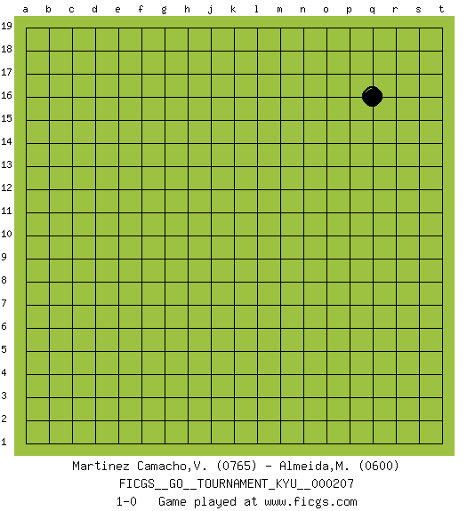 Last move : 1-0 2021 February 9 16:32:31 [Event "FICGS__GO__TOURNAMENT_KYU__000207"] [Site "FICGS"] [Date "2021.01.09"] [Round "1"] [Black "Martinez Camacho,Victor Hugo"] [White "Almeida,Mariana"] [Result "1-0"] [Rating 1 "0765"] [Rating 2 "0600"] 1.q16 1-0 This go game has been lost on time (started : 2021.01.09 23:8:4) Here are the names of the openings (joseki) played in the four corners : Player Black won this Go (weiqi, baduk) game. Follow this game move after move (download)Capture what you cut off. (Anonymous) The worth of a book is to be measured by what you can carry away from it. (James Bryce)