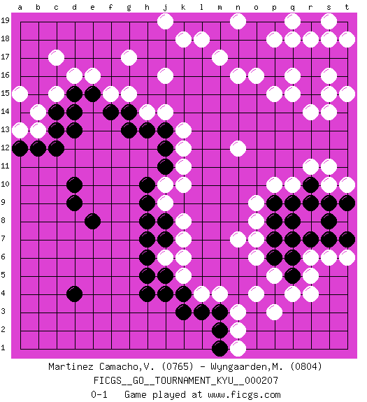 Last move : 0-1 2021 April 14 15:46:21 [Event "FICGS__GO__TOURNAMENT_KYU__000207"] [Site "FICGS"] [Date "2021.01.09"] [Round "1"] [Black "Martinez Camacho,Victor Hugo"] [White "Wyngaarden,Martin"] [Result "0-1"] [Rating 1 "0765"] [Rating 2 "0804"] 1.d4 d16 2.e8 j16 3.d13 q4 4.k4 q16 5.e15 q10 6.d15 l4 7.l3 m4 8.k3 k10 9.h4 j14 10.h8 e16 11.d10 k5 12.j4 f15 13.f14 g15 14.g14 h14 15.g13 m17 16.j13 k13 17.h13 k12 18.j12 j10 19.j11 k11 20.h10 k7 21.j7 j6 22.h6 k8 23.j5 k6 24.h9 j9 25.h7 n7 26.m3 n3 27.p4 p3 28.q5 p5 29.p6 o4 30.q6 r4 31.q7 r5 32.q8 r6 33.q9 p10 34.r10 r11 35.r9 s11 36.p9 o9 37.r7 s10 38.s8 o7 39.p8 o8 40.s9 o6 41.s7 s6 42.t9 t10 43.t7 c15 44.c14 b14 45.c13 b13 46.c12 t6 47.b12 a13 48.a12 a15 49.m2 n2 50.m1 n1 51.r16 s16 52.r15 q15 53.r17 s15 54.q17 q18 55.p17 p18 56.o17 o16 57.n17 n16 58.n18 r18 59.s17 s18 60.t17 t18 61.m18 s19 62.o18 q19 63.o19 s14 64.m19 l18 65.l19 k18 66.p16 r14 67.p19 p15 68.t16 t15 69.k19 j19 70.p7 n19 71.d9 c17 72.d14 n12 73.j8 g17 74.h5 pass 0-1 Here are the names of the openings (joseki) played in the four corners : Player White won this Go (weiqi, baduk) game. Follow this game move after move (download)If a formation is symmetrical, play at the center. (Anonymous) I have opinions of my own - strong opinions - but I don't always agree with them. (George Bush)