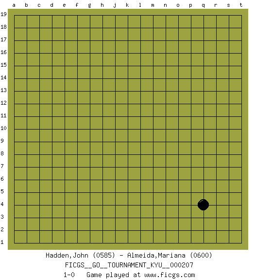 Last move : 1-0 2021 February 11 12:11:7 [Event "FICGS__GO__TOURNAMENT_KYU__000207"] [Site "FICGS"] [Date "2021.01.09"] [Round "1"] [Black "Hadden,John"] [White "Almeida,Mariana"] [Result "1-0"] [Rating 1 "0585"] [Rating 2 "0600"] 1.q4 1-0 This go game has been lost on time (started : 2021.01.09 23:8:4) Here are the names of the openings (joseki) played in the four corners : Corner q4 : q4 1-0 Hoshi (Hwajeom, Seongjeom, Xingwei`) 4-4 Point. The star or hoshi (4-4) point, emphasizing influence at the potential expense of territory. Player Black won this Go (weiqi, baduk) game. Follow this game move after move (download)Nothing requires doing this or that, but necessity exists. (Pierre Audouard) Every man's memory is his private literature. (Aldous Huxley)