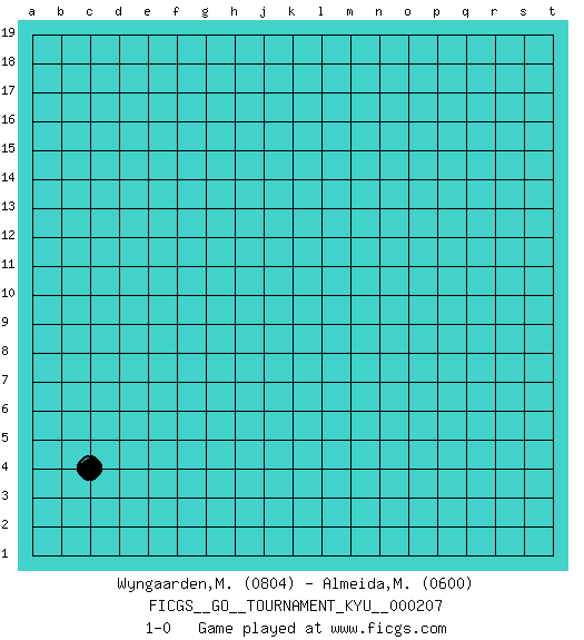 Last move : 1-0 2021 February 9 4:8:48 [Event "FICGS__GO__TOURNAMENT_KYU__000207"] [Site "FICGS"] [Date "2021.01.09"] [Round "1"] [Black "Wyngaarden,Martin"] [White "Almeida,Mariana"] [Result "1-0"] [Rating 1 "0804"] [Rating 2 "0600"] 1.c4 1-0 This go game has been lost on time (started : 2021.01.09 23:8:4) Here are the names of the openings (joseki) played in the four corners : Corner d4 : c4 1-0 Komoku (Somok, Xiao~mu`) 3-4 Point. The komoku (3-4) point is the traditional corner enclosure move.. Player Black won this Go (weiqi, baduk) game. Follow this game move after move (download)Do not fear furikawari. (Anonymous) War is the child of passion, passion is the child of narcissism and narcissism is the child. (...) Another game ? (Thibault de Vassal)