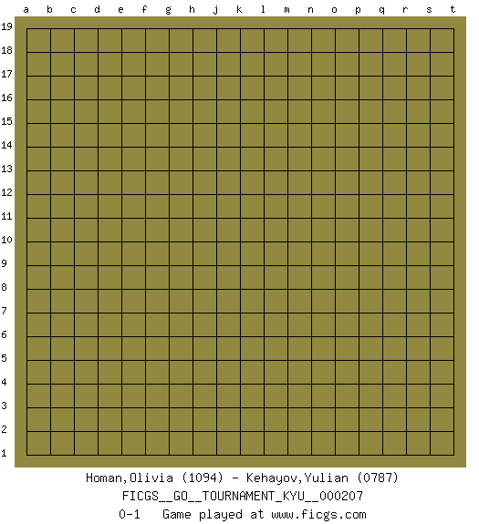 Last move : 0-1 2021 February 9 4:8:48 [Event "FICGS__GO__TOURNAMENT_KYU__000207"] [Site "FICGS"] [Date "2021.01.09"] [Round "1"] [Black "Homan,Olivia"] [White "Kehayov,Yulian"] [Result "0-1"] [Rating 1 "1094"] [Rating 2 "0787"] 0-1 This go game has been lost on time (started : 2021.01.09 23:8:4) Here are the names of the openings (joseki) played in the four corners : Player White won this Go (weiqi, baduk) game. Follow this game move after move (download)The enemy's vital point is your own. (Anonymous) Fortune favours the audacious. (Desiderius Erasmus)