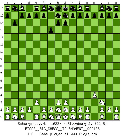 Last move : 1-0 2021 February 12 1:32:38 [Event "FICGS__BIG_CHESS__TOURNAMENT__000126"] [Site "FICGS"] [Date "2021.01.09"] [Round "1"] [White "Schangareev,Mirzian"] [Black "Rivenburg,John"] [Result "1-0"] [WhiteElo "1623"] [BlackElo "1148"] 1.e2-e3 g15-g13 2.p1-o3 b15-b14 3.n2-n4 1-0 This big chess game has been lost on time (started : 2021.01.09 23:39:21) Follow this game move after move (download)Nonsense was the last thing Fischer was interested in, as far as Chess was concerned. (Elie Agur) Sie führen leise Selbstgespräche, schlürfen lautstark ihre Getränke, schmatzen hörbar beim Essen, blasen ihrem Gegenüber Rauch in die Augen, niesen ihm ins Gesicht, starren ihn unverwandt an, bis er sich unter ihren Blicken windet, rutschen ständig auf ihrem Stuhl hin und her, rülpsen und bohren in der Nase. (Anonymous) Dios mío, Bobby Fischer juega tan simple. (Alexei Suetin) C'est la seule position que je connaisse où les deux camps sont mals. Propos prêtés à V. Anand. 'preceded by its own quotation yields a falsehood' preceded by its own quotation yields a falsehood. (W. V. O. Quine - Set Theory And Its Logic, 1953)