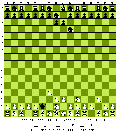 Last move : 0-1 2021 February 14 18:46:27 [Event "FICGS__BIG_CHESS__TOURNAMENT__000126"] [Site "FICGS"] [Date "2021.01.09"] [Round "1"] [White "Rivenburg,John"] [Black "Kehayov,Yulian"] [Result "0-1"] [WhiteElo "1148"] [BlackElo "1630"] 1.g2-g4 j15-k13 2.j2-l3 h16-o10 3.o2-o3 o10-f2 0-1 This big chess game has been lost on time (started : 2021.01.09 23:39:21) Follow this game move after move (download)There are tough players and nice guys, and I'm a tough player. (Bobby Fischer) Sitze auf Deine Hände. (Siegbert Tarrasch) Los Peones son nacidos libres, y aún así, se encuentran por doquier encadenados. (Rick Kennedy) Les échecs, c'est la lutte contre l'erreur. (Johannes Zukertort) Wisdom doesn't necessarily come with age. Sometimes age just shows up all by itself. (Tom Watson)