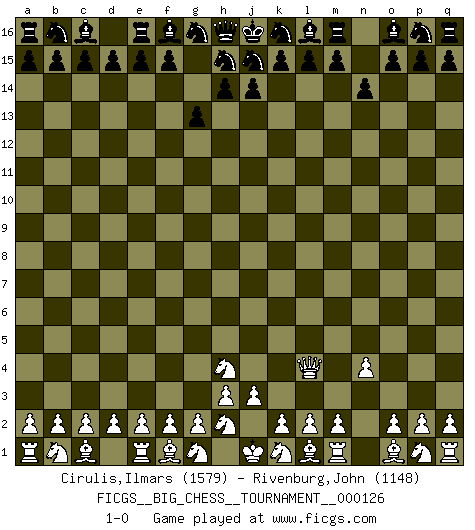 Last move : 1-0 2021 February 12 1:32:38 [Event "FICGS__BIG_CHESS__TOURNAMENT__000126"] [Site "FICGS"] [Date "2021.01.09"] [Round "1"] [White "Cirulis,Ilmars"] [Black "Rivenburg,John"] [Result "1-0"] [WhiteElo "1579"] [BlackElo "1148"] 1.j2-h4 g15-g13 2.n2-n4 n15-n14 3.h1-l4 1-0 This big chess game has been lost on time (started : 2021.01.09 23:39:21) Follow this game move after move (download)When your house is on fire, you can't be bothered with the neighbors. Or, as we say in Chess, if your King is under attack you don't worry about losing a Pawn on the Queen's side. (Gary Kasparov) Ich tröste mich mit dem Vergnügen, daß Schachfans, Zuschauer und Leser glücklich sind, wenn ein Großmeister etwas riskiert, statt nur Klötzchen zu schieben. (Mikhail Nekhemyevich Tal) Aquel que ve no otra dirección en el juego que la de dar Jaque Mate a su oponente, nunca será un buen jugador de Ajedrez. (Euwe) Les échecs sont un jeu par leur forme, un art par leur essence et une science par sa difficulté d'acquisition. Ils peuvent vous procurer autant de plaisir qu'un bon livre ou une belle musique, mais vous n'aurez une réelle joie que si vous arrivez à bien jouer. (Tigran Petrosian) You know what they say : You lie down with the Devil, you wake up in Hell. (Horatio Caine, C.S.I. Miami)