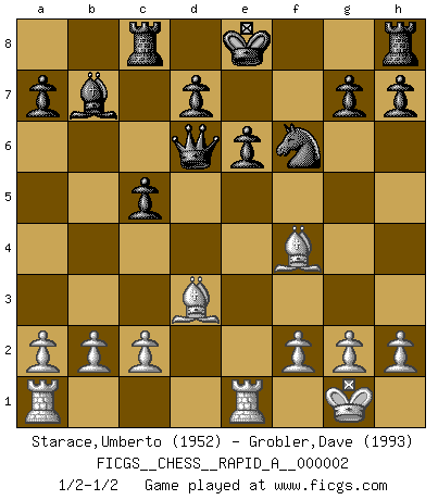 Last move : 1/2-1/2 2006 July 2 12:7:3 [Event "FICGS__CHESS__RAPID_A__000002"] [Site "FICGS"] [Date "2006.06.23"] [Round "1"] [White "Starace,Umberto"] [Black "Grobler,Dave"] [Result "1/2-1/2"] [WhiteElo "1952"] [BlackElo "1993"] 1.e4 c5 2.Nf3 Nc6 3.d4 cxd4 4.Nxd4 Nf6 5.Nc3 e6 6.Nxc6 bxc6 7.e5 Nd5 8.Ne4 f5 9.exf6 Nxf6 10.Nd6+ Bxd6 11.Qxd6 Qb6 12.Bd3 c5 13.Bf4 Bb7 14.O-O Rc8 15.Rfe1 Qxd6 1/2-1/2 Sicilian defense Kingside Castling by player White (move 14) This chess game ended in a draw. Follow this game move after move (download)Bobby just drops the pieces and they fall on the right squares. (Miguel Najdorf) Ich bewundere Kasparows phantasievolle Angriffssiege aus den Achtzigern und Neunzigern, aber wenn man sie mit dem Computer überprüft, nimmt der Computer in jeder zweiten Partie die Opfer an, verteidigt sich und gewinnt. (Vladimir Kramnik) Los problemas de Ajedrez exigen del compositor las mismas virtudes que caracterizan todo el arte de valor: originalidad, invención, concisión, armonía, complejidad e insinceridad explendida. (Vladimir Nabokov) Soyez une menace à chaque fois que vous vous asseyez pour jouer. (Ken Smith) Memory is a way of holding onto the things you love, the things you are, the things you never want to lose. (from the television show: The Wonder Years)