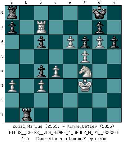 Last move : 1-0 2007 December 18 12:7:50 [Event "FICGS__CHESS__WCH_STAGE_1_GROUP_M_01__000003"] [Site "FICGS"] [Date "2007.07.11"] [Round "1"] [White "Zubac,Marius"] [Black "Kuhne,Detlev"] [Result "1-0"] [WhiteElo "2365"] [BlackElo "2325"] 1.d4 Nf6 2.c4 e6 3.Nc3 Bb4 4.f3 d5 5.a3 Bxc3+ 6.bxc3 O-O 7.cxd5 exd5 8.e3 Nh5 9.Qc2 Re8 10.g4 Nf4 11.h4 c5 12.Kf2 Ng6 13.Bd3 Nc6 14.h5 Nf8 15.Ne2 c4 16.Bf5 h6 17.e4 Bxf5 18.gxf5 dxe4 19.fxe4 Nd7 20.Bf4 Nf6 21.e5 Nd5 22.Qe4 f6 23.Rag1 Kh8 24.Rg6 Nxf4 25.Nxf4 Qb6 26.e6 Qb2+ 27.Ne2 Ne7 28.Qf4 Kh7 29.Qg4 Nxg6 30.hxg6 Kg8 31.Qe4 Qb6 32.Rb1 Qc6 33.Qxc6 bxc6 34.Rb7 Reb8 35.Rc7 Rb5 36.Kf3 Rb1 37.Nf4 1-0 Nimzo-Indian : Kmoch variation Kingside Castling by player Black (move 6) Player White won this chess game. Follow this game move after move (download)Chess, like love, like music, has the power to make people happy. (Siegbert Tarrasch) Die Leute spielen gegen mich seit 15 Jahren unter Ihren Möglichkeiten. (Robert James Fischer) Yo no le temo a Spassky. Todos saben que yo soy el mejor. Uno no necesita un torneo para probarlo. (Bobby Fischer) Les échecs, c'est l'art d'analyser. (Mikhail Botvinnik) They say in chess you've got to kill the queen, and then you mate it... Oh I, do you ? (Red Hot Chili Peppers, Fortune faded)