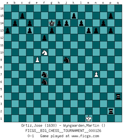 Last move : 0-1 2021 June 21 23:18:43 [Event "FICGS__BIG_CHESS__TOURNAMENT__000126"] [Site "FICGS"] [Date "2021.01.09"] [Round "1"] [White "Ortiz,Jose"] [Black "Wyngaarden,Martin"] [Result "0-1"] [WhiteElo "1630"] [BlackElo ""] 1.d2-d4 g15-g13 2.c1-f4 h16-f14 3.e2-e3 n15-n13 4.f1-c4 m15-m13 5.b2-b4 b15-b14 6.a2-a3 c16-b15 7.b1-d2 e15-e14 8.g1-f3 f16-c13 9.n2-n3 l16-o13 10.a1-c1 o16-n15 11.h2-g4 q15-q14 12.o1-g8 l15-l14 13.f4-c7 h15-j13 14.o2-o3 n15-p13 15.p2-p4 p16-o14 16.c7-e5 q16-n16 17.g8-d5 d15-d14 18.e5-f4 b16-d15 19.f4-p13 q14-p13 20.k1-l3 n16-q16 21.d5-e4 o13-e4 22.d2-e4 q16-q14 23.q2-q4 m16-q16 24.q4-q5 d15-e13 25.k2-k3 k16-m15 26.f3-e5 f14-f5 27.f2-f3 f5-o13 28.c2-c3 f15-f13 29.m2-m4 j16-h15 30.l1-k2 g16-f14 31.j2-h4 j15-k13 32.j1-j2 m15-l13 33.q1-q3 o14-n12 34.h1-h2 n12-l11 35.c4-d3 o13-n12 36.m1-n1 n12-k12 37.h2-f4 o15-o14 38.q5-q6 q14-q6 39.q3-p3 q6-q2 40.e1-l1 k12-f12 41.h4-f5 f12-p3 42.l3-n4 b15-n4 43.o3-n4 p3-p4 44.n4-n5 q16-q12 45.g4-h2 e16-q16 46.f4-k4 a15-a13 47.e5-g4 q12-o12 48.m4-m5 q16-q4 49.k4-p4 q4-p4 50.p1-o3 o12-o3 51.n5-n6 o3-o2 52.j2-k1 p4-p2 53.h2-j4 o2-l2 54.l1-l2 p2-l2 55.k1-j2 a16-q16 56.c1-k1 q2-n2 57.d3-b5 n2-n3 58.n1-n3 c13-n3 59.k1-m1 l11-k9 60.m1-m3 n3-l1 61.h3-h4 q16-q2 62.m3-l3 l2-l3 63.g4-j5 l1-k2 64.j4-k2 k9-l7 65.j5-l4 l7-m5 66.e4-g3 l3-p3 67.b5-e8 p3-p2 68.g3-j4 p2-p1 69.j2-h3 p1-c1 70.e8-b11 f14-d13 71.f5-g7 c1-c3 72.e3-e4 c3-a3 73.g7-f9 a3-a4 74.d4-d5 a4-b4 75.f9-d10 b4-b10 76.b11-d13 e14-d13 77.d10-c8 b10-b2 78.c8-e9 k13-j11 79.g2-g4 j11-h9 80.h4-h5 j13-h11 81.e9-g10 f13-f12 82.g10-h8 e13-f11 83.h3-g3 f11-g9 84.h8-f9 g9-h7 85.k2-h3 h9-f8 86.h3-f4 h11-g9 87.j4-g5 h7-g5 88.f4-e6 g5-e6 89.d5-e6 f8-e6 90.f3-f4 b2-b3 91.g3-h4 e6-f4 92.k3-k4 f4-g2 93.h4-g5 q2-h2 94.f9-h10 g2-j3 95.l4-j3 b3-j3 96.h10-g12 h15-g14 97.g12-f10 m5-k4 98.f10-d11 j3-g3 99.e4-e5 h2-g2 100.g5-h6 g3-g4 101.e5-e6 g4-h4 102.h6-j5 g2-h2 103.d11-f10 k4-h5 104.e6-e7 l13-k11 105.e7-e8 k11-j9 106.e8-e9 g9-f7 107.j5-j6 h5-f6 108.j6-k5 h4-h6 109.k5-k4 h2-h5 110.n6-n7 h5-q5 111.k4-j4 h6-p6 112.j4-k3 q5-q4 113.k3-l2 p6-p3 114.l2-m1 p3-p2 0-1 Follow this game move after move (download)When your house is on fire, you can't be bothered with the neighbors. Or, as we say in Chess, if your King is under attack you don't worry about losing a Pawn on the Queen's side. (Gary Kasparov) Es macht mich traurig, wenn ich sehe, dass Golfprofis mehr verdienen als Schachsportler. Obwohl ich davon überzeugt bin, dass wir Schachspieler viel härter trainieren müssen als die Golfer. (Alexandra Kosteniuk) Coloca el contenido del tablero de Ajedrez en un sombrero, agita las piezas vigorosamente, derrámalas en el tablero desde una altura de medio metro y así obtienes el estilo de Wilhelm Steinitz. (H. E. Bird) A ce moment-là, je menaçais de comprendre la position ! (Clément L'Heureux) Now you put water in a cup, it becomes the cup; You put water into a bottle it becomes the bottle; You put it in a teapot it becomes the teapot. Water can flow or it can crash. Be water, my friend. (Bruce Lee)