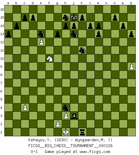 Last move : 0-1 2021 April 19 0:8:41 [Event "FICGS__BIG_CHESS__TOURNAMENT__000126"] [Site "FICGS"] [Date "2021.01.09"] [Round "1"] [White "Kehayov,Yulian"] [Black "Wyngaarden,Martin"] [Result "0-1"] [WhiteElo "1630"] [BlackElo ""] 1.j2-k4 p15-p14 2.h1-o7 p16-o14 3.o7-f15 g16-f14 4.f15-c12 b16-c14 5.m2-m4 b15-b14 6.n2-n4 a15-a13 7.c12-c7 j15-k13 8.e2-e4 c16-b15 9.d2-d4 o16-p15 10.e4-e5 e15-e13 11.o1-f9 l15-l14 12.p1-o3 h16-p9 13.l1-p5 p9-f9 14.q1-n1 f9-f2 15.g1-f3 f2-p11 16.c7-e7 p11-m14 17.e7-m14 n15-m14 18.f1-c4 m14-m13 19.m4-m5 m15-m14 20.m1-m4 f16-c13 21.m4-m2 l16-o13 22.b1-a3 m16-m15 23.c1-h6 q16-n16 24.o3-q4 g15-g13 25.m2-m4 c13-m4 26.l2-l3 m4-o2 27.n1-n2 o2-k6 28.e1-f1 m15-n15 29.k1-m2 c14-d12 30.h2-j4 k6-g9 31.p5-n3 g9-h10 32.p2-p3 o14-n12 33.j1-j2 n12-l13 34.h6-j7 e16-f16 35.f3-h2 f16-f15 36.n2-o2 a16-f16 37.o2-o10 f14-g12 38.f1-f15 f16-f15 39.a1-f1 f15-f1 40.h2-f1 h15-j13 41.c4-f7 k16-h15 42.j7-d12 e13-d12 43.n3-d12 j16-j15 44.j4-h6 n16-f16 45.e5-e6 p15-d4 46.c2-c3 d4-l11 47.o10-q10 q15-q13 48.h6-j8 b15-j8 49.f1-g3 l11-o8 50.q10-o10 o8-n9 51.o10-o7 n9-g3 52.o7-j7 l13-k11 53.k4-h5 g3-o10 54.a3-c2 j8-c2 55.q4-o5 k13-h12 56.j7-j8 c2-j8 57.q2-q4 j8-g6 58.f7-g6 o13-g6 59.h5-j7 g6-c10 60.j7-g8 h10-e13 61.d12-e13 g12-e13 62.j2-h2 c10-l2 63.o5-m4 l2-n4 64.m2-n4 n15-n4 65.m5-m6 n4-m4 66.l3-m4 f16-f2 67.e6-e7 f2-b2 68.e7-e8 b2-a2 69.e8-e9 a2-a1 70.c3-c4 a1-p1 71.p3-p4 p1-p4 72.q4-q5 p4-m4 73.m6-m7 m4-m7 74.q5-q6 m7-m2 75.h2-j2 o10-q8 76.q6-q7 m2-k2 77.j2-h1 q8-p9 78.e9-e10 p9-j3 79.q7-q8 h12-g10 80.q8-q9 g10-h8 81.e10-e11 h8-g6 82.g8-f10 g6-h4 83.e11-e12 k2-k1 0-1 Follow this game move after move (download)Pawns: they are the soul of this game, they alone form the attack and defense. (Philidor) Im Spitzenschach von heute geht es nur um Vorbereitung, um tiefgründige, sorgfältige Eröffnungsvorbereitung. (Nigel Short) Los Peones son nacidos libres, y aún así, se encuentran por doquier encadenados. (Rick Kennedy) La tactique est l'élément le plus important du milieu de jeu. (Siegbert Tarrasch) Ah, beer! The cause of, and the solution to, all of life's problems. (Homer Simpson)