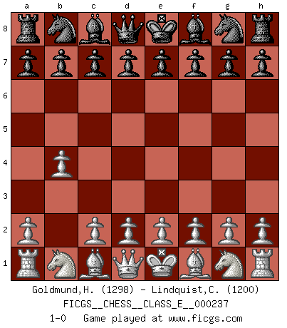 Last move : 1-0 2021 February 21 21:51:43 [Event "FICGS__CHESS__CLASS_E__000237"] [Site "FICGS"] [Date "2021.01.11"] [Round "1"] [White "Goldmund,Heike"] [Black "Lindquist,Christian"] [Result "1-0"] [WhiteElo "1298"] [BlackElo "1200"] 1.b4 1-0 This chess game has been lost on time (started : 2021.01.11 22:29:20) Polish (Sokolsky) opening Player White won this chess game. Follow this game move after move (download)If one piece is badly posted, the whole game is bad. (Tarrasch) Je mehr wir mit Computern analysieren, desto mehr glauben wir an Verteidigung. (Vladimir Kramnik) El muchacho (en ese entonces un niño de 12 años llamado Anatoly Karpov) no tiene ni idea de lo que es el Ajedrez y no hay futuro en absoluto para el en esta profesión. (Mikhail Botvinnik) Les Echecs sont et restent toujours un combat, un combat intégral comme la boxe, la lutte ou un autre sport, et où il doit y avoir un vainqueur et un vaincu. (Joseph Emil Diemer) The best teachers teach from the heart, not from the book. (Author unknown)
