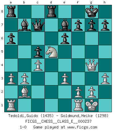 Last move : 1-0 2021 February 8 13:56:16 [Event "FICGS__CHESS__CLASS_E__000237"] [Site "FICGS"] [Date "2021.01.11"] [Round "1"] [White "Tedoldi,Guido"] [Black "Goldmund,Heike"] [Result "1-0"] [WhiteElo "1435"] [BlackElo "1298"] 1.c4 b6 2.d4 Nf6 3.Nc3 Bb7 4.e3 e6 5.Nf3 c5 6.h3 Be7 7.Be2 O-O 8.O-O d5 9.b3 a6 10.Ne5 Nbd7 11.Ng4 Qc7 12.Bb2 Nxg4 13.Bxg4 Nf6 14.a3 Nxg4 15.Qxg4 Rfd8 16.dxc5 bxc5 17.Nxd5 1-0 English Opening Kingside Castling by player Black (move 7) Kingside Castling by player White (move 8) Player White won this chess game. Follow this game move after move (download)Even the laziest King flees wildly in the face of a double check ! (Aaron Nimzowitsch) Woher wissen wir, daß der Neanderthaler Blindschach gespielt hat? -- Bei Ausgrabungen wurden keine Schachbretter und Figuren gefunden. (Anonymous) Una buena ofensiva y una buena defensa, comienzan ambas con un buen desarrollo. (Bruce A. Moon) Les sacrifices démontrent seulement que quelqu'un a gaffé. (Savielly Tartacover) The large trees attract high winds. (Chinese proverb)