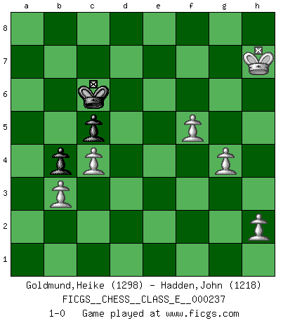 Last move : 1-0 2021 May 5 23:13:50 [Event "FICGS__CHESS__CLASS_E__000237"] [Site "FICGS"] [Date "2021.01.11"] [Round "1"] [White "Goldmund,Heike"] [Black "Hadden,John"] [Result "1-0"] [WhiteElo "1298"] [BlackElo "1218"] 1.e4 e5 2.Nf3 Nc6 3.Bc4 d6 4.c3 Be6 5.Bxe6 fxe6 6.d4 exd4 7.Nxd4 Qd7 8.Bf4 e5 9.Nxc6 Qxc6 10.Bg3 Nf6 11.O-O Qxe4 12.Nd2 Qg6 13.Qa4+ c6 14.Rfe1 Be7 15.Rad1 O-O 16.Qc4+ d5 17.Qe2 Bd6 18.Bxe5 Bxe5 19.Qxe5 Rae8 20.Qc7 Qf7 21.Qxf7+ Kxf7 22.f3 Rxe1+ 23.Rxe1 Re8 24.Rxe8 Nxe8 25.Kf2 Nd6 26.Ke3 Nc4+ 27.Nxc4 dxc4 28.Kd4 Ke6 29.Kxc4 Kd6 30.Kd4 c5+ 31.Ke4 Kc6 32.g4 b5 33.b3 a6 34.Ke5 b4 35.c4 Kb6 36.Ke6 Kc6 37.Kf7 a5 38.Kxg7 Kb6 39.Kxh7 a4 40.f4 axb3 41.axb3 Kc6 42.f5 1-0 King's pawn game Kingside Castling by player White (move 11) Kingside Castling by player Black (move 15) 10 pieces endgame at move 40 : White KPPPPP , Black KPPP WHITE : King + 5 Pawns BLACK : King + 3 Pawns 9 pieces endgame at move 41 : White KPPPPP , Black KPP WHITE : King + 5 Pawns BLACK : King + 2 Pawns Player White won this chess game. Follow this game move after move (download)The boy (then a 12 year old boy named Anatoly Karpov) doesn't have a clue about Chess, and there's no future at all for him in this profession. (Mikhail Botvinnik) Ihnen, Herr Lasker, habe ich nur drei Worte zu sagen: Schach und matt. (Siegbert Tarrasch) El sobresalir en el Ajedrez es un signo de una mente intrigante. (Sir Arthur Conan Doyle) Toutes choses étant égales, c'est la conviction qui gagne. Alliée à une volonté de vaincre, elle sert de détonateur, suscite des idées, disperse les doutes et aide à penser clairement. (Robert Fischer) May the force be with you. (Han Solo in Star Wars ep.4)