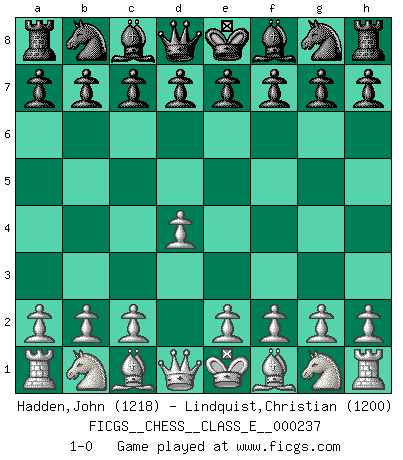 Last move : 1-0 2021 February 21 9:52:10 [Event "FICGS__CHESS__CLASS_E__000237"] [Site "FICGS"] [Date "2021.01.11"] [Round "1"] [White "Hadden,John"] [Black "Lindquist,Christian"] [Result "1-0"] [WhiteElo "1218"] [BlackElo "1200"] 1.d4 1-0 This chess game has been lost on time (started : 2021.01.11 22:29:20) Queen's pawn Player White won this chess game. Follow this game move after move (download)Live, lose, and learn, by observing your opponent how to win. (Amber Steenbock) Alle offensichtlichen Züge sehen nach dem Spiel in der Analyse verdächtig aus. (Viktor Kortschnoi) Combinaciones deslumbrantes son para la mayoría, mover madera es para los pocos. (Georg Kieninger) A ce moment-là, je menaçais de comprendre la position ! (Clément L'Heureux) It's not the size of the dog in the fight, it's the size of the fight in the dog. (Mark Twain)