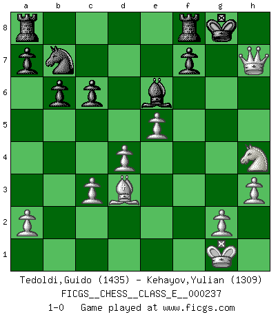 Last move : 1-0 2021 March 16 7:22:22 [Event "FICGS__CHESS__CLASS_E__000237"] [Site "FICGS"] [Date "2021.01.11"] [Round "1"] [White "Tedoldi,Guido"] [Black "Kehayov,Yulian"] [Result "1-0"] [WhiteElo "1435"] [BlackElo "1309"] 1.c4 e5 2.Nc3 Nf6 3.d3 Nc6 4.Nf3 d5 5.cxd5 Nxd5 6.e4 Nxc3 7.bxc3 Bg4 8.Be2 Be7 9.h3 Bd7 10.O-O O-O 11.Be3 Bd6 12.Rb1 b6 13.Nh2 h6 14.f4 exf4 15.Bxf4 Bxf4 16.Rxf4 Na5 17.d4 c6 18.e5 Be6 19.Qd2 Qg5 20.Nf3 Qg6 21.Bd3 Qh5 22.Rh4 Qxh4 23.Nxh4 Nb7 24.Rf1 Na5 25.Rf3 Nb7 26.Rg3 g5 27.Rxg5+ hxg5 28.Qxg5+ Kh8 29.Qh6+ Kg8 30.Qh7+ 1-0 English Opening Kingside Castling by player White (move 10) Kingside Castling by player Black (move 10) Player White won this chess game. Follow this game move after move (download)Help your pieces so they can help you. (Paul Morphy) Viele Opfer benötigen überhaupt keine konkrete Berechnung. Es genügt sich die entstehende Position kurz vorzustellen, um uns davon zu überzeugen, dass das Opfer korrekt ist. (Mikhail Nekhemyevich Tal) El Ajedrez es un juego de pelea el cual es puramente intelectual e incluye la suerte. (Richard Reti) Il n'y a pas eu de défaite parce que je ne crois pas que cet ordinateur ait jamais existé. IBM a triché en refusant d'imprimer les modes de recherche de la machine. C'est évident, pendant le match, des coups décisifs ont été joués par des êtres humains. Aujourd'hui, les meilleurs spécialistes en informatique ne peuvent toujours pas expliquer comment Deep-Blue a pu jouer contre la logique des ordinateurs. IBM a gagné une guerre de communication, mais ils sont incapables de prouver que l'ordinateur a gagné tout seul. (Garry Kasparov) The greatest con, that he ever pulled... was making you believe... that he is you. (Revolver, movie)