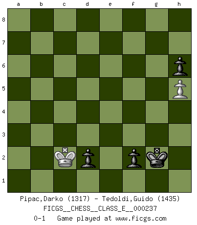 Last move : 0-1 2021 March 24 19:30:31 [Event "FICGS__CHESS__CLASS_E__000237"] [Site "FICGS"] [Date "2021.01.11"] [Round "1"] [White "Pipac,Darko"] [Black "Tedoldi,Guido"] [Result "0-1"] [WhiteElo "1317"] [BlackElo "1435"] 1.e4 c5 2.Nf3 d6 3.h3 Nc6 4.Bb5 Bd7 5.Nc3 e6 6.b3 Nf6 7.d3 a6 8.Bxc6 Bxc6 9.Bb2 h6 10.O-O Be7 11.e5 Nd7 12.exd6 Bxd6 13.Ne4 Nf6 14.Nxd6+ Qxd6 15.Bxf6 gxf6 16.d4 Rg8 17.g3 Qd5 18.Kg2 Rd8 19.c4 Qxf3+ 20.Qxf3 Bxf3+ 21.Kxf3 Rxd4 22.Rad1 Ke7 23.Rxd4 cxd4 24.Rd1 e5 25.Ke4 Ke6 26.g4 Rd8 27.h4 a5 28.f3 Rg8 29.a3 b6 30.b4 axb4 31.axb4 Rc8 32.Rc1 Rd8 33.Kd3 Rc8 34.c5 Rc6 35.Kc4 bxc5 36.bxc5 f5 37.Kb5 Rc8 38.gxf5+ Kxf5 39.c6 Kf4 40.Kc5 d3 41.Kd6 d2 42.Rf1 Ke3 43.Kd7 Ke2 44.Rb1 Rxc6 45.Kxc6 Kxf3 46.Kd5 e4 47.Kd4 e3 48.Kd3 Kf2 49.Rd1 f5 50.Kc2 f4 51.Rh1 f3 52.h5 Kg2 53.Rd1 f2 54.Rxd2 exd2 0-1 Sicilian Kingside Castling by player White (move 10) 10 pieces endgame at move 44 : White KRPP , Black KRPPPP WHITE : King + 1 Rook 2 Pawns BLACK : King + 1 Rook 4 Pawns 9 pieces endgame at move 45 : White KRPP , Black KPPPP WHITE : King + 1 Rook 2 Pawns BLACK : King + 4 Pawns 8 pieces endgame at move 45 : White KRP , Black KPPPP WHITE : King + 1 Rook 1 Pawn BLACK : King + 4 Pawns 7 pieces endgame at move 54 : White KRP , Black KPPP WHITE : King + 1 Rook 1 Pawn BLACK : King + 3 Pawns 6 pieces endgame at move 54 : White KP , Black KPPP WHITE : King + 1 Pawn BLACK : King + 3 Pawns Player Black won this chess game. Follow this game move after move (download)A sacrifice is best refuted by accepting it. (Wilhelm Steinitz) Es ist schade, dass viele Schachsportler vergessen, wie wichtig Auftreten und angemessene Kleidung sind. (Alexandra Kosteniuk) El Ajedrez es el arte del análisis. (Mikhail Botvinnik) Ce qui est bien, c'est d'avoir tout un tas de pièces en prise : l'adversaire ne peut en prendre qu'une à la fois. Cité par Thierry Audin. I have opinions of my own - strong opinions - but I don't always agree with them. (George Bush)