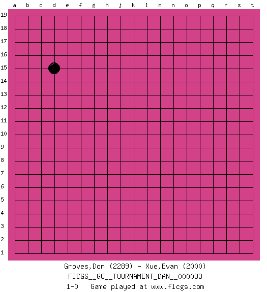 Last move : 1-0 2021 February 12 1:32:38 [Event "FICGS__GO__TOURNAMENT_DAN__000033"] [Site "FICGS"] [Date "2021.01.13"] [Round "1"] [Black "Groves,Don"] [White "Xue,Evan"] [Result "1-0"] [Rating 1 "2289"] [Rating 2 "2000"] 1.d15 1-0 This go game has been lost on time (started : 2021.01.13 0:36:18) Here are the names of the openings (joseki) played in the four corners : Player Black won this Go (weiqi, baduk) game. Follow this game move after move (download)Strike at the waist of the knight's move. (Anonymous) There's always a bigger fish. (Qui-Gon Jinn in Star Wars ep.1)