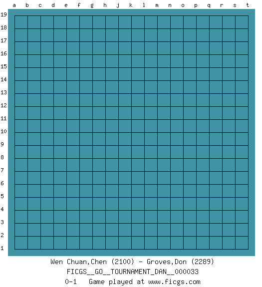 Last move : 0-1 2021 February 12 1:32:38 [Event "FICGS__GO__TOURNAMENT_DAN__000033"] [Site "FICGS"] [Date "2021.01.13"] [Round "1"] [Black "Wen Chuan,Chen"] [White "Groves,Don"] [Result "0-1"] [Rating 1 "2100"] [Rating 2 "2289"] 0-1 This go game has been lost on time (started : 2021.01.13 0:36:18) Here are the names of the openings (joseki) played in the four corners : Player White won this Go (weiqi, baduk) game. Follow this game move after move (download)Answer the keima with a kosumi. (Anonymous) Inventor: A person who makes an ingenious arrangement of wheels, levers and springs, and believes it civilization. (Ambrose Bierce, The Devil's Dictionary)