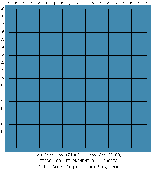 Last move : 0-1 2021 February 12 1:32:38 [Event "FICGS__GO__TOURNAMENT_DAN__000033"] [Site "FICGS"] [Date "2021.01.13"] [Round "1"] [Black "Lou,Jianying"] [White "Wang,Yao"] [Result "0-1"] [Rating 1 "2100"] [Rating 2 "2100"] 0-1 This go game has been lost on time (started : 2021.01.13 0:36:18) Here are the names of the openings (joseki) played in the four corners : Player White won this Go (weiqi, baduk) game. Follow this game move after move (download)One big eye kills one small eye. (Anonymous) Every now and then a man's mind is stretched by a new idea and never shrinks back to its former dimensions. (Oliver Wendell Holmes, Sr.)