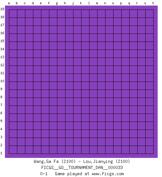 Last move : 0-1 2021 February 12 1:32:38 [Event "FICGS__GO__TOURNAMENT_DAN__000033"] [Site "FICGS"] [Date "2021.01.13"] [Round "1"] [Black "Wang,Ga Fa"] [White "Lou,Jianying"] [Result "0-1"] [Rating 1 "2100"] [Rating 2 "2100"] 0-1 This go game has been lost on time (started : 2021.01.13 0:36:18) Here are the names of the openings (joseki) played in the four corners : Player White won this Go (weiqi, baduk) game. Follow this game move after move (download)Empty triangles are bad. (Anonymous) The difference between perseverance and obstinacy is that one comes from a strong will, and the other from a strong won't. (Henry Ward Beecher)