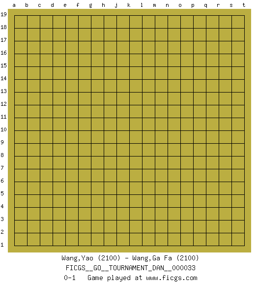 Last move : 0-1 2021 February 12 1:32:38 [Event "FICGS__GO__TOURNAMENT_DAN__000033"] [Site "FICGS"] [Date "2021.01.13"] [Round "1"] [Black "Wang,Yao"] [White "Wang,Ga Fa"] [Result "0-1"] [Rating 1 "2100"] [Rating 2 "2100"] 0-1 This go game has been lost on time (started : 2021.01.13 0:36:18) Here are the names of the openings (joseki) played in the four corners : Player White won this Go (weiqi, baduk) game. Follow this game move after move (download)Don't count territory held by only one eye. (Anonymous) No, I am still playing. (Anatoly Karpov)