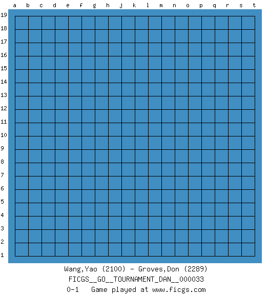 Last move : 0-1 2021 February 12 1:32:38 [Event "FICGS__GO__TOURNAMENT_DAN__000033"] [Site "FICGS"] [Date "2021.01.13"] [Round "1"] [Black "Wang,Yao"] [White "Groves,Don"] [Result "0-1"] [Rating 1 "2100"] [Rating 2 "2289"] 0-1 This go game has been lost on time (started : 2021.01.13 0:36:18) Here are the names of the openings (joseki) played in the four corners : Player White won this Go (weiqi, baduk) game. Follow this game move after move (download)The monkey jump is worth eight points. (Anonymous) Philosophers use a language that is already deformed as though by shoes that are too tight. (Ludwig Wittgenstein)