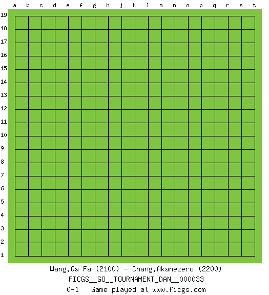 Last move : 0-1 2021 February 12 1:32:38 [Event "FICGS__GO__TOURNAMENT_DAN__000033"] [Site "FICGS"] [Date "2021.01.13"] [Round "1"] [Black "Wang,Ga Fa"] [White "Chang,Akanezero"] [Result "0-1"] [Rating 1 "2100"] [Rating 2 "2200"] 0-1 This go game has been lost on time (started : 2021.01.13 0:36:18) Here are the names of the openings (joseki) played in the four corners : Player White won this Go (weiqi, baduk) game. Follow this game move after move (download)Use a wall to attack, not to make territory. (Anonymous) In God we trust, all others we virus scan. (Anonymous)