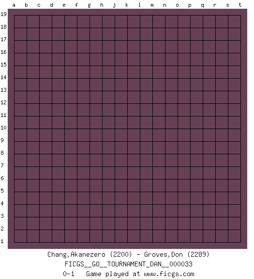 Last move : 0-1 2021 February 12 1:32:38 [Event "FICGS__GO__TOURNAMENT_DAN__000033"] [Site "FICGS"] [Date "2021.01.13"] [Round "1"] [Black "Chang,Akanezero"] [White "Groves,Don"] [Result "0-1"] [Rating 1 "2200"] [Rating 2 "2289"] 0-1 This go game has been lost on time (started : 2021.01.13 0:36:18) Here are the names of the openings (joseki) played in the four corners : Player White won this Go (weiqi, baduk) game. Follow this game move after move (download)The saki bottle shape is negative. (Anonymous) There are lots of people who mistake their imagination for their memory. (Josh Bilings)