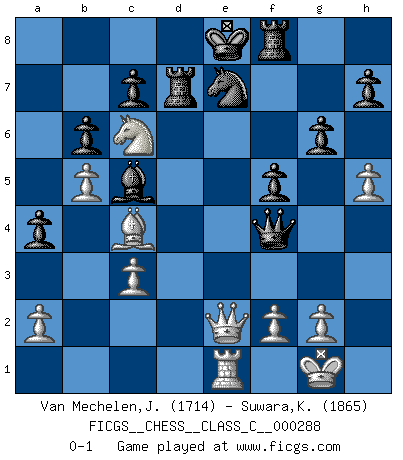 Last move : 0-1 2021 May 20 14:4:34 [Event "FICGS__CHESS__CLASS_C__000288"] [Site "FICGS"] [Date "2021.01.13"] [Round "1"] [White "Van Mechelen,Jan"] [Black "Suwara,Kazimierz"] [Result "0-1"] [WhiteElo "1714"] [BlackElo "1865"] 1.Nf3 d5 2.c4 d4 3.b4 f6 4.e3 e5 5.c5 a5 6.Qa4+ Bd7 7.b5 Bxc5 8.Bc4 Ne7 9.exd4 exd4 10.Ba3 Na6 11.O-O Nb4 12.Re1 b6 13.Nc3 dxc3 14.dxc3 Kf8 15.Rad1 Nc2 16.Qxc2 Bxa3 17.Rxd7 Qxd7 18.Nd4 Ke8 19.Qe4 Rb8 20.Nc6 Rd8 21.Bb3 Bc5 22.Qc4 Rf8 23.Qe2 a4 24.Bc4 g6 25.h4 f5 26.Qe5 Qd6 27.Qe2 Rd7 28.h5 Qf4 0-1 Reti : Advance variation Kingside Castling by player White (move 11) Player Black won this chess game. Follow this game move after move (download)A Chess game is a dialogue, a conversation between a player and his opponent. Each move by the opponent may contain threats or be a blunder, but a player cannot defend against threats or take advantage of blunders if he does not first ask himself: What is my opponent planning after each move ? (Bruce A. Moon) Ich war zu klein für die Schach-Schülermannschaft! (Woody Allen) Haz el enroque temprano y seguido. (Rob Sillars) Vous savez, camarade Pachman, je n'éprouve pas de plaisir à être ministre, je jouerais plutôt aux échecs comme vous, ou alors ferais une révolution au Venezuela. (Che Guevara à Ludek Pachman, 'Checkmate in Prague', 1975) The Internet is the first thing that humanity has build that humanity doesn't understand, the largest experiment in anarchy that we have ever had. (Eric Schmidt)