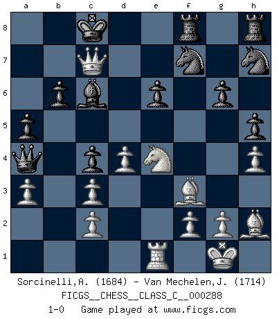 Last move : 1-0 2021 February 7 13:9:17 [Event "FICGS__CHESS__CLASS_C__000288"] [Site "FICGS"] [Date "2021.01.13"] [Round "1"] [White "Sorcinelli,Andrea"] [Black "Van Mechelen,Jan"] [Result "1-0"] [WhiteElo "1684"] [BlackElo "1714"] 1.e4 e6 2.d4 d5 3.Nc3 Bb4 4.e5 c5 5.a3 Bxc3+ 6.bxc3 Qa5 7.Bd2 Qa4 8.Qb1 c4 9.Ne2 Nc6 10.Ng3 Bd7 11.Nh5 g6 12.Ng3 O-O-O 13.Qb2 f6 14.exf6 Nxf6 15.Be2 h5 16.h4 Rdf8 17.Rb1 b6 18.O-O Nd8 19.Rfe1 Nf7 20.Bf4 Rfg8 21.Qc1 Nh7 22.Rb4 Qc6 23.Ne4 a5 24.Rxc4 dxc4 25.Bf3 Qa4 26.Bh2 Bc6 27.Qf4 Rf8 28.Qc7+ 1-0 French : Winawer, Advance variation Queenside Castling by player Black (move 12) Kingside Castling by player White (move 18) Player White won this chess game. Follow this game move after move (download)Pawn endings are to Chess what putting is to golf. (Cecil Purdy) Ich weiss nicht was Gott gegen mich auf 1.e4 antworten würde. (Robert James Fischer) Bobby es el jugador de Ajedrez mas fino que este país jamás haya producido. Su memoria para las movidas, su brillantez en soñar combinaciones y su feróz determinación por la victoria son algo extraño. (John Collins) Mais l'homme est une créature légère et illogique : semblable au joueur d'échecs, il n'aime que le processus du but à atteindre, non le but lui-même. (Dostoïevsky) Luck is the residue of design. (John Milton)