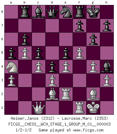 Last move : 1/2-1/2 2007 September 13 19:49:41 [Event "FICGS__CHESS__WCH_STAGE_1_GROUP_M_01__000003"] [Site "FICGS"] [Date "2007.07.11"] [Round "1"] [White "Helmer,Janos"] [Black "Lacrosse,Marc"] [Result "1/2-1/2"] [WhiteElo "2312"] [BlackElo "2353"] 1.c4 g6 2.Nc3 c5 3.g3 Bg7 4.Bg2 Nc6 5.Nf3 d6 6.O-O Bd7 7.a3 Nf6 8.Rb1 a5 9.d3 O-O 10.Bd2 Ne8 11.Ne1 Nc7 12.Nc2 Rb8 13.b4 b6 14.b5 Nd4 15.h3 Bc8 16.e3 Nxc2 17.Qxc2 Qd7 18.Na4 d5 19.Rbd1 d4 20.e4 Ne8 21.f4 Qc7 22.Rde1 Bb7 23.Qd1 e5 24.f5 Bc8 25.g4 Qd8 26.Re2 Bf6 27.Qc1 Bh4 28.Bh6 Ng7 29.Bd2 Ne8 1/2-1/2 English Opening Kingside Castling by player White (move 6) Kingside Castling by player Black (move 9) This chess game ended in a draw. Follow this game move after move (download)I'd rather have a Pawn than a finger. (Reuben Fine) Das Schach ist nichts für kleine Geister, es beansprucht einen vollen Mann, der sich nicht sklavisch an das Überlieferte hält, sondern selbständig die Tiefen des Spiels zu ergründen sucht. (Wilhelm Steinitz) El Ajedrez es un juego terrible. Si no dominas el centro, tu oponente tiene una posición mas libre. Si tu tienes el centro, entonces realmente tienes algo de que preocuparte. (Siegbert Tarrasch) Le jeu d'échecs fait naître et fortifie en nous plusieurs qualités précieuses dans le cours de l'existence, telles que la prévoyance, la circonspection, la prudence, et la persévérance. (Benjamin Franklin - 1783, la morale des échecs) Over-the-board chess is the favorite of mortals, correspondence chess is the favorite of the gods. (Eduard Dyckhoff)