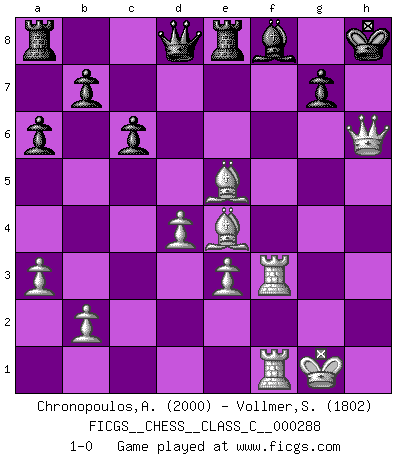 Last move : 1-0 2021 February 7 1:26:50 [Event "FICGS__CHESS__CLASS_C__000288"] [Site "FICGS"] [Date "2021.01.13"] [Round "1"] [White "Chronopoulos,Antonis"] [Black "Vollmer,Steve"] [Result "1-0"] [WhiteElo "2000"] [BlackElo "1802"] 1.d4 Nf6 2.c4 e6 3.Nf3 d5 4.Nc3 Be7 5.Bf4 O-O 6.e3 a6 7.cxd5 exd5 8.h3 c6 9.Bd3 Nbd7 10.O-O Re8 11.a3 Qb6 12.Qd2 Bf8 13.Rae1 Ne4 14.Qc2 f5 15.g4 fxg4 16.hxg4 Ndf6 17.Ne5 Nxg4 18.Nxg4 Bxg4 19.f3 Bxf3 20.Rxf3 Qa5 21.Ref1 Nf6 22.Be5 Ne4 23.Nxe4 dxe4 24.Bxe4 h6 25.Qb3+ Kh8 26.Qe6 Qd8 27.Qxh6+ 1-0 Queen's pawn game Kingside Castling by player Black (move 5) Kingside Castling by player White (move 10) Player White won this chess game. Follow this game move after move (download)I won't play with you anymore. You have insulted my friend. - When an opponent cursed himself for a blunder. (Miguel Najdorf) Schach ist ein Teil der Kultur, und wenn es mit der Kultur abwärts geht, geht es auch mit dem Schach abwärts. (Mikhail Moiseyevich Botvinik) El Ajedrez moderno está demasiado preocupado con cosas como la estructura de Peones. Olvidenlo, el Jaque Mate termina la partida. (Nigel Short) Même si vous avez un bon coup à faire, regardez toujours s'il n'y en a pas un qui lui soit préférable. (Pedro Damiano) History is the quarrels of popes and kings, with wars or pestilences in every page; the men all so good for nothing, and hardly any women at all. (Jane Austen)
