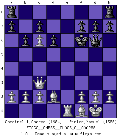 Last move : 1-0 2021 January 18 18:57:54 [Event "FICGS__CHESS__CLASS_C__000288"] [Site "FICGS"] [Date "2021.01.13"] [Round "1"] [White "Sorcinelli,Andrea"] [Black "Pintor,Manuel"] [Result "1-0"] [WhiteElo "1684"] [BlackElo "1588"] 1.e4 e5 2.Nf3 Nc6 3.Bb5 Qf6 4.Nc3 Qg6 5.O-O Nf6 6.d4 exd4 7.Nd5 Nxd5 8.exd5 Nb4 9.Re1+ Be7 10.Rxe7+ Kxe7 11.Qe1+ Kd8 12.Qxb4 d6 13.Bd2 Bh3 14.Bf1 b6 15.Nxd4 Bd7 16.Nc6+ Bxc6 17.dxc6 Ke7 18.Re1+ Kf6 19.Qc3+ 1-0 Ruy Lopez (Spanish Opening) Kingside Castling by player White (move 5) Player White won this chess game. Follow this game move after move (download)Fischer wanted to give the Russians a taste of their own medicine. (Larry Evans) Wenn du gegen Bobby spielst, ist es keine Frage von gewinnen oder verlieren. Es ist eine Frage des Überlebens. (Boris Vassilievich Spassky) Yo adoro todas la posiciones. Denme una partida posicional difícil, y la jugaré. Pero posiciones totalmente ganadas, no las tolero. (Hein Donner) La guerre est enfant de la passion, la passion est enfant du narcissisme et le narcissisme est l'enfant. (...) Une autre partie ? (Thibault de Vassal) Once you start thinking you have nothing left to learn, you have everything to learn. (Steve Badget)