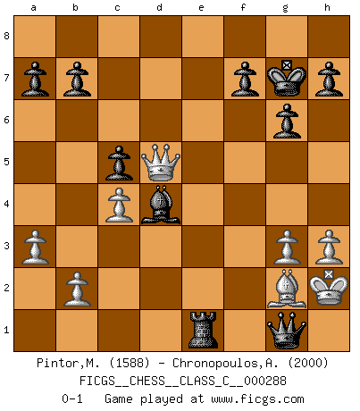 Last move : 0-1 2021 February 3 8:51:36 [Event "FICGS__CHESS__CLASS_C__000288"] [Site "FICGS"] [Date "2021.01.13"] [Round "1"] [White "Pintor,Manuel"] [Black "Chronopoulos,Antonis"] [Result "0-1"] [WhiteElo "1588"] [BlackElo "2000"] 1.e4 c5 2.f4 d5 3.exd5 Nf6 4.c4 e6 5.dxe6 Bxe6 6.Nf3 Nc6 7.Nc3 g6 8.d3 Bg7 9.Be2 O-O 10.O-O Re8 11.Ng5 Bf5 12.Nge4 Nxe4 13.dxe4 Bxe4 14.Nxe4 Rxe4 15.Rb1 Qe7 16.Bd3 Rd8 17.Qf3 Re1 18.h3 Nb4 19.Rxe1 Qxe1+ 20.Bf1 Re8 21.a3 Na2 22.Kh2 Nxc1 23.Bd3 Re3 24.Rxc1 Qxc1 25.Qd5 Bd4 26.Be4 Re1 27.Qd8+ Kg7 28.Qd5 Qxf4+ 29.g3 Qf2+ 30.Bg2 Qg1+ 0-1 Sicilian : Grand Prix attack Kingside Castling by player Black (move 9) Kingside Castling by player White (move 10) Player Black won this chess game. Follow this game move after move (download)I am the best player in the world and I am here to prove it. (Bobby Fischer) Die Neutralität betrachte ich als eine schwere Krankheit. (Viktor Kortschnoi) El arma más poderosa en el Ajedrez, es tener la próxima movida. (David Bronstein) Les réformistes prétendent que les progrès de la théorie conduiront à la disparition des échecs, et qu'il faut, pour leur rendre vie, en remanier les règles. En réalité, qu'exprime cette affirmation? Le mépris de l'intuition, de l'imagination et de tous les autres éléments qui font des échecs un art. (Alexander Alekhine) Knowledge rests not upon truth alone, but upon error also. (Carl G. Jung)
