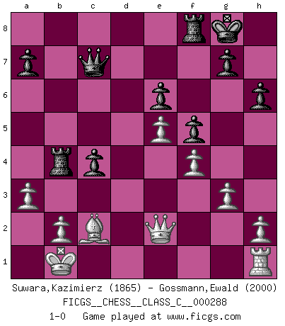 Last move : 1-0 2021 July 11 22:21:58 [Event "FICGS__CHESS__CLASS_C__000288"] [Site "FICGS"] [Date "2021.01.13"] [Round "1"] [White "Suwara,Kazimierz"] [Black "Gossmann,Ewald"] [Result "1-0"] [WhiteElo "1865"] [BlackElo "2000"] 1.e4 e6 2.d4 d5 3.Nc3 Nf6 4.Bg5 dxe4 5.Nxe4 Nbd7 6.Nf3 h6 7.Nxf6+ Nxf6 8.Be3 Bd6 9.Bd3 O-O 10.Qe2 b6 11.O-O-O Bb7 12.Ne5 Nd5 13.c3 c5 14.Bc2 Qc7 15.Qd3 f5 16.Nf3 c4 17.Qe2 b5 18.Bd2 Nf4 19.Bxf4 Bxf4+ 20.Kb1 Bd5 21.g3 Bd6 22.Ne5 Bxh1 23.Rxh1 Bxe5 24.dxe5 Rab8 25.f4 b4 26.cxb4 Rxb4 27.a3 1-0 French : Burn variation Kingside Castling by player Black (move 9) Queenside Castling by player White (move 11) Player White won this chess game. Follow this game move after move (download)Becoming successful at Chess allows you to discover your own personality. That's what I want for the kids I teach. (Saudin Robovic) Die unerbitterlichsten Regeln im Schach sind die Ausnahmen. (Savielly Grigorievitsch Tartakower) El Ajedrez es 99 por ciento táctica. (Teichmann) Dans le domaine de la peinture, de la gravure et de la sculpture, dès la première décennie de notre siècle, les artistes abandonnent la représentation de la partie d'échecs pour se concentrer sur les pièces, sur les échiquiers et sur toutes les variations auxquelles les unes et les autres peuvent donner lieu. On passe en quelque sorte d'un thème social à un thème musical (au sens de la musica médiévale, c'est-à-dire d'une notion qui inclue le rythme, l'harmonie, la construction et la déconstruction, etc.). Graphiquement et picturalement, l'échiquier apparaît comme une structure ouverte, dynamique, d'une richesse infinie, autorisant toutes les combinatoires et débouchant sur des mouvements et des rythmes de nature exponentielle. (Michel Pastoureau) There are 10 types of people in this world: those who understand binary and those who don't. (Anonymous)