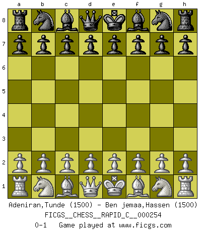 Last move : 0-1 2021 February 14 6:23:27 [Event "FICGS__CHESS__RAPID_C__000254"] [Site "FICGS"] [Date "2021.01.14"] [Round "1"] [White "Adeniran,Tunde"] [Black "Ben jemaa,Hassen"] [Result "0-1"] [WhiteElo "1500"] [BlackElo "1500"] 0-1 This chess game has been lost on time (started : 2021.01.14 20:54:12) Player Black won this chess game. Follow this game move after move (download)To avoid losing a piece, many a person has lost the game. (Savielly Tartakover) Wer wird heute Abend ihr Gegner sein? -- Heute Abend spiele ich gegen die schwarzen Steine. (Akiba Rubinstein) El Ajedrez se juega con la mente... ¡no con las manos!. (Renaud y Kahn) Si le désir cupide (et stupide) de gagner est une inépuisable source de souffrance, une combinaison brillante sur l'échiquier est une découverte : le coquelicot qui s'épanouit lorsque apparaît la Voie Lactée. (Arrabal) History is a gallery of pictures in which there are few originals and many copies. (Alexis de Tocqueville)
