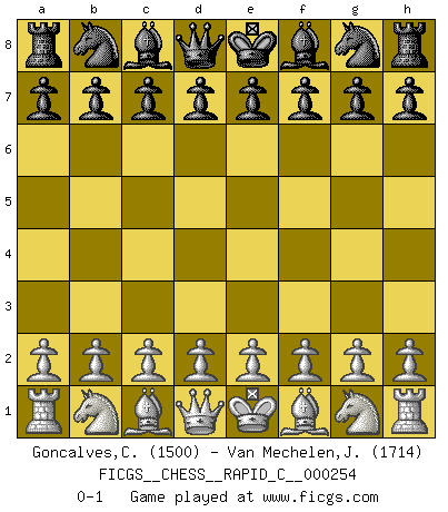 Last move : 0-1 2021 February 14 6:23:27 [Event "FICGS__CHESS__RAPID_C__000254"] [Site "FICGS"] [Date "2021.01.14"] [Round "1"] [White "Goncalves,Celio"] [Black "Van Mechelen,Jan"] [Result "0-1"] [WhiteElo "1500"] [BlackElo "1714"] 0-1 This chess game has been lost on time (started : 2021.01.14 20:54:12) Player Black won this chess game. Follow this game move after move (download)When I have White, I win because I am white; When I have Black, I win because I am Bogolyubov. (Bogolyubov) Jede Eröffnung ist gut genug um gespielt zu werden, wenn nur ihr Ruf schlecht genug ist. (Savielly Grigorievitsch Tartakower) Peones: ellos son el alma de esta partida, solos forman el ataque y la defensa. (Philidor) RxDa4 pat (...) Wisdom begins at the end. (Daniel Webster)