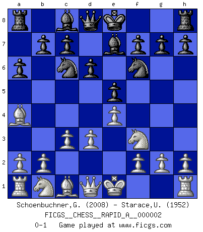 Last move : 0-1 2006 July 1 16:40:28 [Event "FICGS__CHESS__RAPID_A__000002"] [Site "FICGS"] [Date "2006.06.23"] [Round "1"] [White "Schoenbuchner,Gert"] [Black "Starace,Umberto"] [Result "0-1"] [WhiteElo "2008"] [BlackElo "1952"] 1.e4 e5 2.Nf3 Nc6 3.Bb5 a6 4.Ba4 Nf6 5.d3 d6 6.c3 Be7 0-1 Ruy Lopez : Anderssen variation Player Black won this chess game. Follow this game move after move (download)I have added these principles to the law: get the Knights into action before both Bishops are developed. (Emanuel Lasker) Als ich elf wurde, wurde ich einfach gut. (Robert James Fischer) Fischer no está bajo la obligación de nadie. (Joseph Platz) Aux échecs, l'amour-propre est satisfait quand on remporte la victoire, mais il n'y a pas de honte à être battu. (Benjamin Franklin) He who fights with monsters should be careful lest he thereby become a monster. (Friedrich Nietzsche, Beyond Good and Evil)