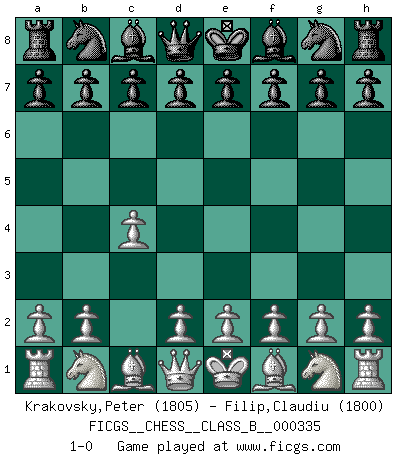 Last move : 1-0 2021 February 25 21:40:51 [Event "FICGS__CHESS__CLASS_B__000335"] [Site "FICGS"] [Date "2021.01.16"] [Round "1"] [White "Krakovsky,Peter"] [Black "Filip,Claudiu"] [Result "1-0"] [WhiteElo "1805"] [BlackElo "1800"] 1.c4 1-0 This chess game has been lost on time (started : 2021.01.16 15:13:49) English Opening Player White won this chess game. Follow this game move after move (download)Chess is a sea in which a gnat may drink and an elephant may bathe. (Hindu proverb) Wenn es im Universum noch irgendwo intelligente Lebewesen gibt, dann kennen sie Go. (Emanuel Lasker) Ciertamente, de todas la drogas del mundo, el Ajedrez debe ser el mas placentero permamentemente. (Assiac) Psychologiquement, tu dois avoir confiance en toi même, mais cette confiance doit être basée sur des faits. (Robert Fischer) You have to believe in yourself. (Sun Tzu)