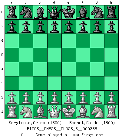 Last move : 0-1 2021 February 25 21:40:51 [Event "FICGS__CHESS__CLASS_B__000335"] [Site "FICGS"] [Date "2021.01.16"] [Round "1"] [White "Sergienko,Artem"] [Black "Boonet,Guido"] [Result "0-1"] [WhiteElo "1800"] [BlackElo "1800"] 0-1 This chess game has been lost on time (started : 2021.01.16 15:13:49) Player Black won this chess game. Follow this game move after move (download)We don't really know how the game was invented, though there are suspicions. As soon as we discover the culprits, we'll let you know. (Bruce Pandolfini) Ich spiele 70 Eröffnungssysteme. (Viktor Kortschnoi) Robert Fischer es la ley hacia si mismo. (Larry Evans) Il vaut toujours mieux jouer un plan faux de façon logique que de n'avoir pas de plan du tout. (Victor Kortchnoï) A cynic is a man who knows the price of everything but the value of nothing. (Oscar Wilde)