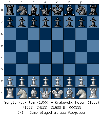 Last move : 0-1 2021 February 25 21:40:51 [Event "FICGS__CHESS__CLASS_B__000335"] [Site "FICGS"] [Date "2021.01.16"] [Round "1"] [White "Sergienko,Artem"] [Black "Krakovsky,Peter"] [Result "0-1"] [WhiteElo "1800"] [BlackElo "1805"] 0-1 This chess game has been lost on time (started : 2021.01.16 15:13:49) Player Black won this chess game. Follow this game move after move (download)Pawns are born free, yet they are everywhere in chains. (Rick Kennedy) Das typische an einem Großmeister ist, daß er eine gewonnene Position schnell und schmerzlos gewinnt. (Irving Chernev) Yo nunca en mi vida he jugado la Defensa Francesa, que viene siendo la más aburrida de todas las Aperturas. (Wilhelm Steinitz) Les échecs, c'est l'imagination. (David Bronstein) Computer Science is no more about computers than astronomy is about telescopes. (Edsger W. Dijkstra)