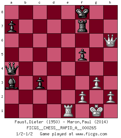 Last move : 1/2-1/2 2021 March 22 9:36:45 [Event "FICGS__CHESS__RAPID_A__000265"] [Site "FICGS"] [Date "2021.01.23"] [Round "1"] [White "Faust,Dieter"] [Black "Maron,Paul"] [Result "1/2-1/2"] [WhiteElo "1950"] [BlackElo "2014"] 1.e4 e6 2.d4 d5 3.Nc3 Nf6 4.Bg5 dxe4 5.Nxe4 Nbd7 6.Nf3 h6 7.Bxf6 Nxf6 8.Bd3 Nxe4 9.Bxe4 c5 10.Qe2 Bd7 11.Ne5 cxd4 12.Bxb7 Qa5+ 13.c3 dxc3 14.O-O Rb8 15.Nc6 Bxc6 16.Bxc6+ Ke7 17.b4 Rxb4 18.Rad1 Kf6 19.a3 Rf4 20.g3 Rf5 21.Be4 g6 22.Bxf5 gxf5 23.Rd7 Bxa3 24.Qh5 Rh7 25.Re1 Qa4 26.Rxf7+ Rxf7 27.Qxh6+ Ke7 28.Qxe6+ Kf8 29.Qh6+ Kg8 30.Qg6+ Kf8 31.Qh6+ Kg8 32.Qg6+ Kf8 33.Qh6+ 1/2-1/2 French : Burn variation Kingside Castling by player White (move 14) This chess game ended in a draw. Follow this game move after move (download)I am the best player in the world and I am here to prove it. (Bobby Fischer) Das ganze Leben mit einer Ehefrau ist wie ein Endspiel mit ungleichfarbigen Läufern. (Viktor Kortschnoi) Todo se encuentra en un estado de flujo y esto incluye al mundo del Ajedrez. (Mikhail Botvinnik) Roi des jeux et jeu des rois, les échecs portent en eux un sentiment d'infini. Ils donnent à celui qui s'est efforcé d'en approfondir les arcanes l'impression de n'être pas à la mesure de l'homme; en fait, ils constituent un résumé de l'univers, un microcosme, et figurent cette grande échelle qui, dans les plans de la lumière descend jusqu'à la matière, qui des abîmes insondables remonte jusqu'en l'infini de Dieu. (Pyrame) Even the best needles are not sharp at both ends. (Chinese proverb)