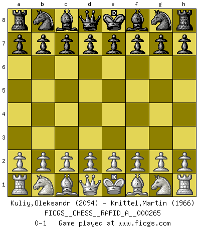 Last move : 0-1 2021 February 23 1:4:31 [Event "FICGS__CHESS__RAPID_A__000265"] [Site "FICGS"] [Date "2021.01.23"] [Round "1"] [White "Kuliy,Oleksandr"] [Black "Knittel,Martin"] [Result "0-1"] [WhiteElo "2094"] [BlackElo "1966"] 0-1 This chess game has been lost on time (started : 2021.01.23 16:11:22) Player Black won this chess game. Follow this game move after move (download)I won't play with you anymore. You have insulted my friend. - When an opponent cursed himself for a blunder. (Miguel Najdorf) Nach Morphy wurde nichts neues mehr in der Behandlung offener Positionen gefunden. (Mikhail Moiseyevich Botvinik) El Ajedrez es un expediente tonto que hace creer a la gente inactiva que hacen una cosa muy astuta cuando solamente estan perdiendo su tiempo. (George Bernard Shaw) Il s'avisa de me proposer d'apprendre les échecs qu'il jouait un peu... me voilà forcené des échecs. J'achète un échiquier, je m'enferme dans ma chambre, j'y passe des jours et des nuits à vouloir apprendre par cur toutes les parties. (Jean-Jacques Rousseau, Confessions) Coffee just isn't my cup of tea. (Unknown)