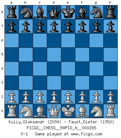 Last move : 0-1 2021 February 23 1:4:31 [Event "FICGS__CHESS__RAPID_A__000265"] [Site "FICGS"] [Date "2021.01.23"] [Round "1"] [White "Kuliy,Oleksandr"] [Black "Faust,Dieter"] [Result "0-1"] [WhiteElo "2094"] [BlackElo "1950"] 0-1 This chess game has been lost on time (started : 2021.01.23 16:11:22) Player Black won this chess game. Follow this game move after move (download)First-class players lose to second class players because second-class players sometimes play a first-class game. (Tarrasch) Frage: Wie viele Autos haben Sie schon zerstört? - Antwort: Nur zwei. (Loek van Wely) Repentinamente, me resultaba obvio en mi analisis que yo había pasado por alto lo que Fischer había visto en el tablero con la mas grande facilidad. (Mikhail Botvinnik) Un journaliste : 'Vous préférez avoir une dame de plus sur l'échiquier ou au lit ?' Boris Spassky : 'Ca dépend de la position.' In theory there is no difference between theory and practice. In practice there is. (Yogi Berra)